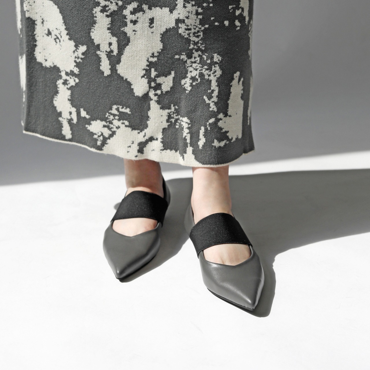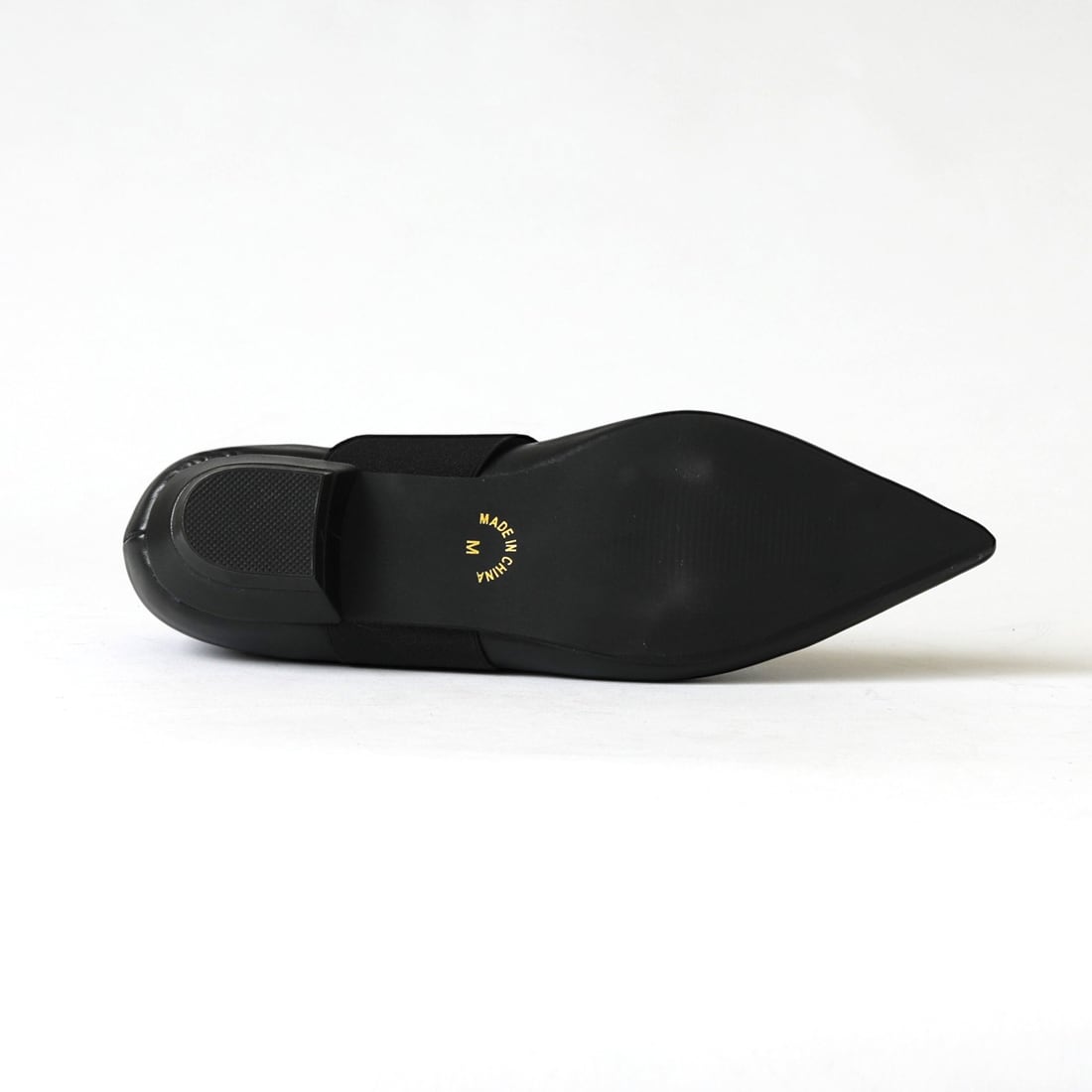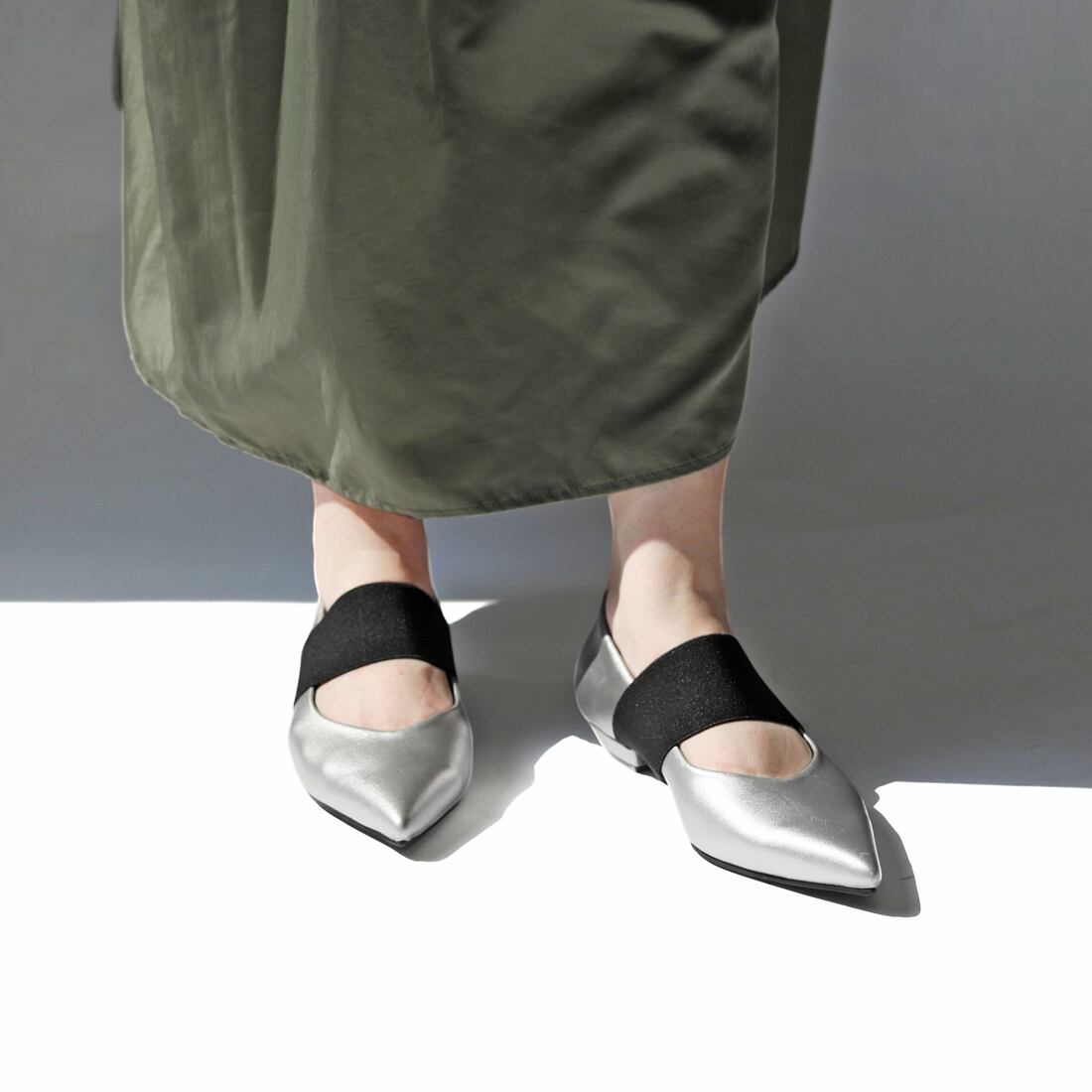 ポインテッドトゥの洗練されたシルエットに、ゴムストラップで履きやすさをプラスしたフラットパンプスです。