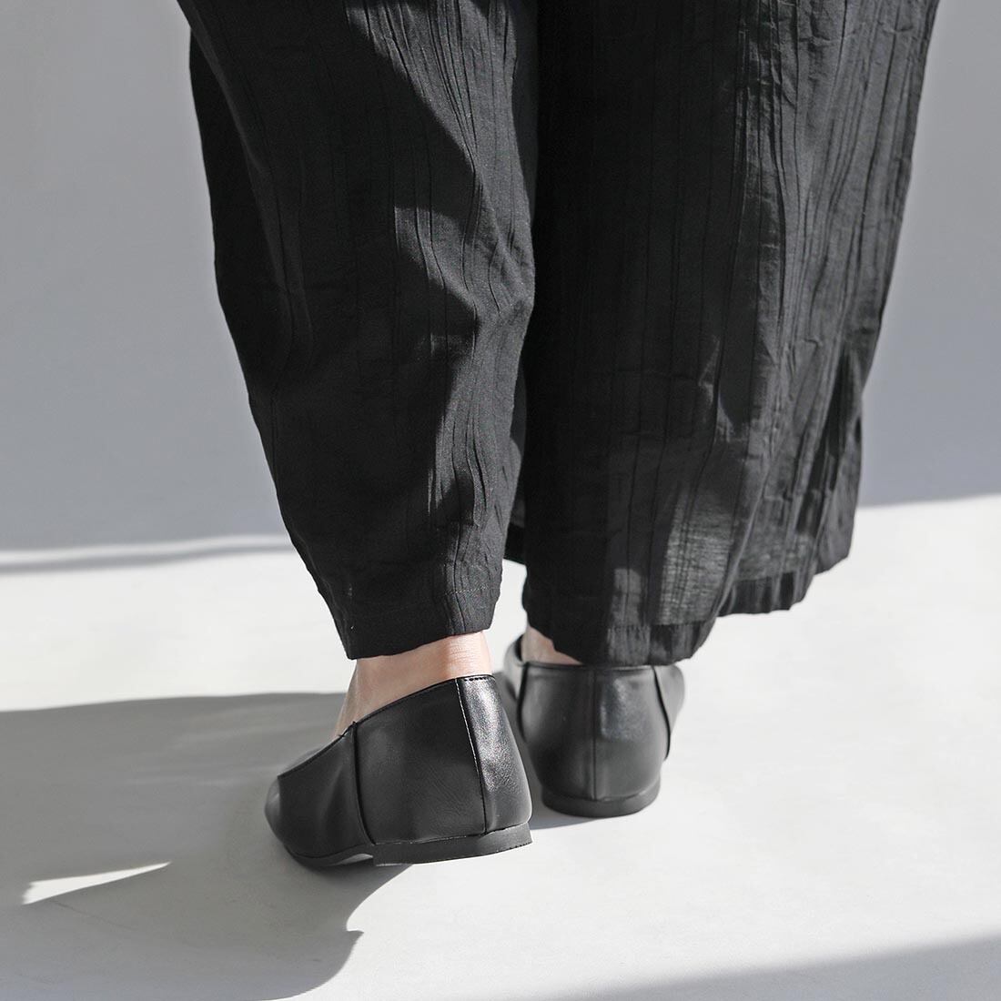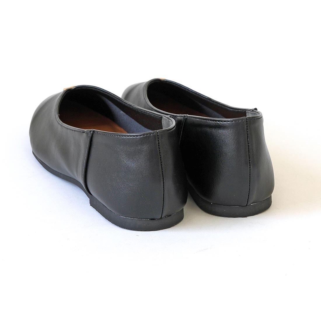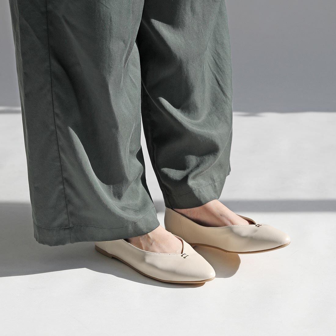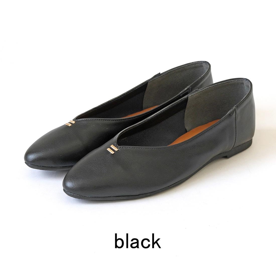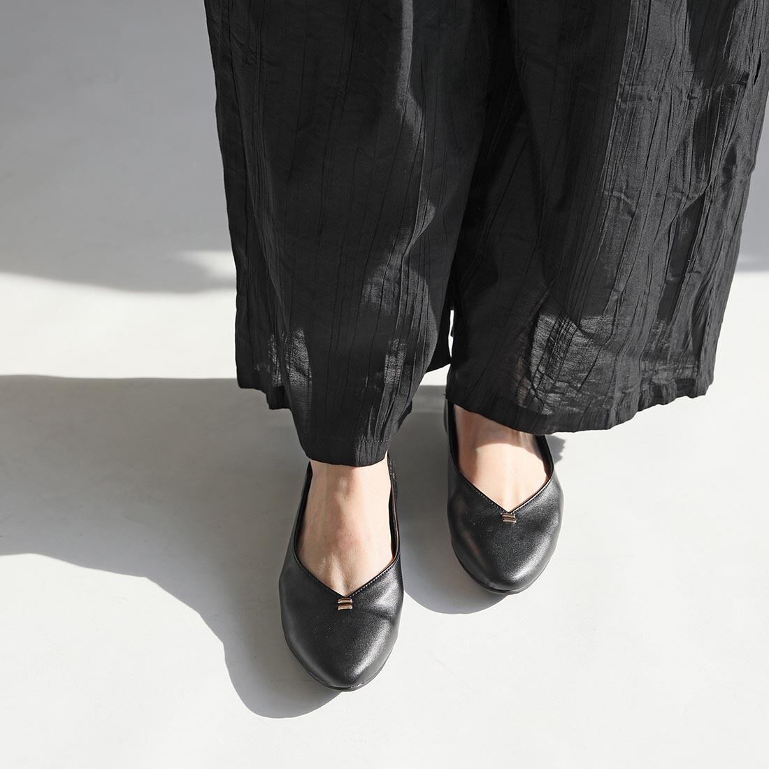 柔らかい合成皮革を使用した、足元をすっきり見せるVカットフラットパンプス。