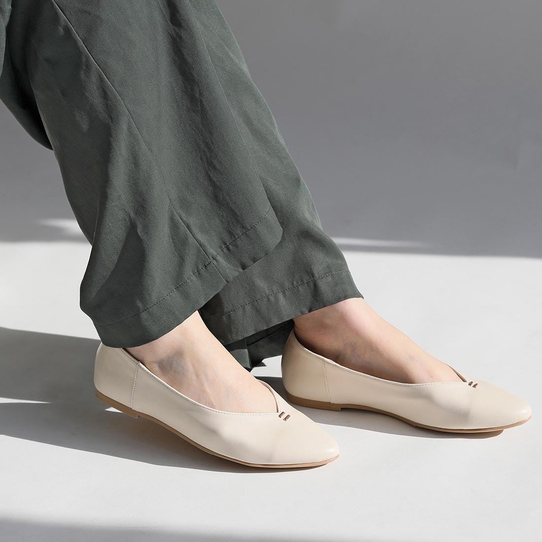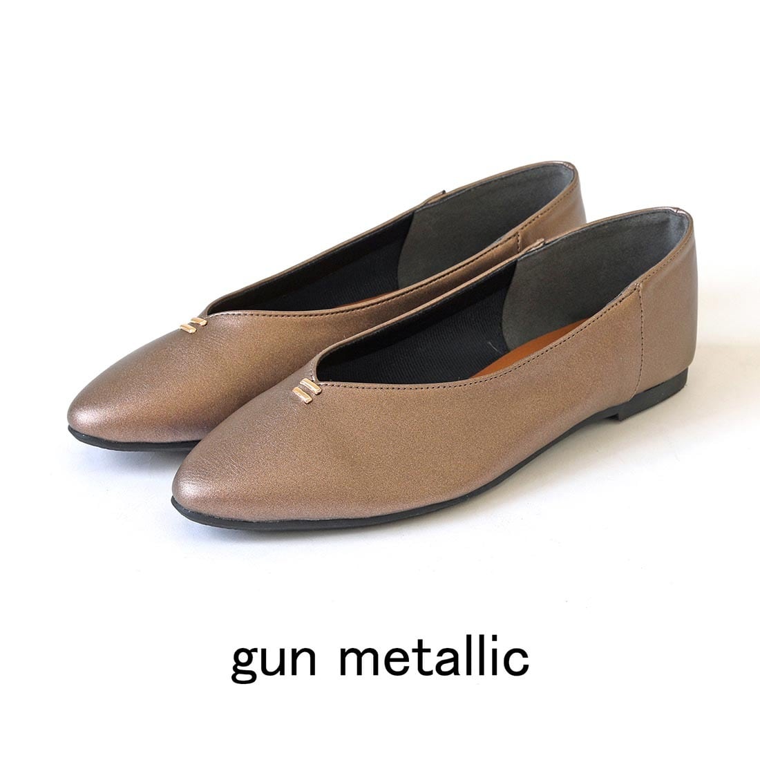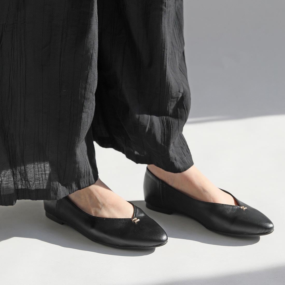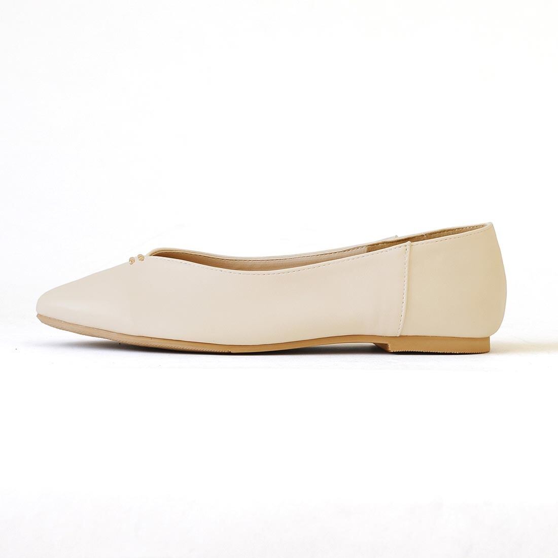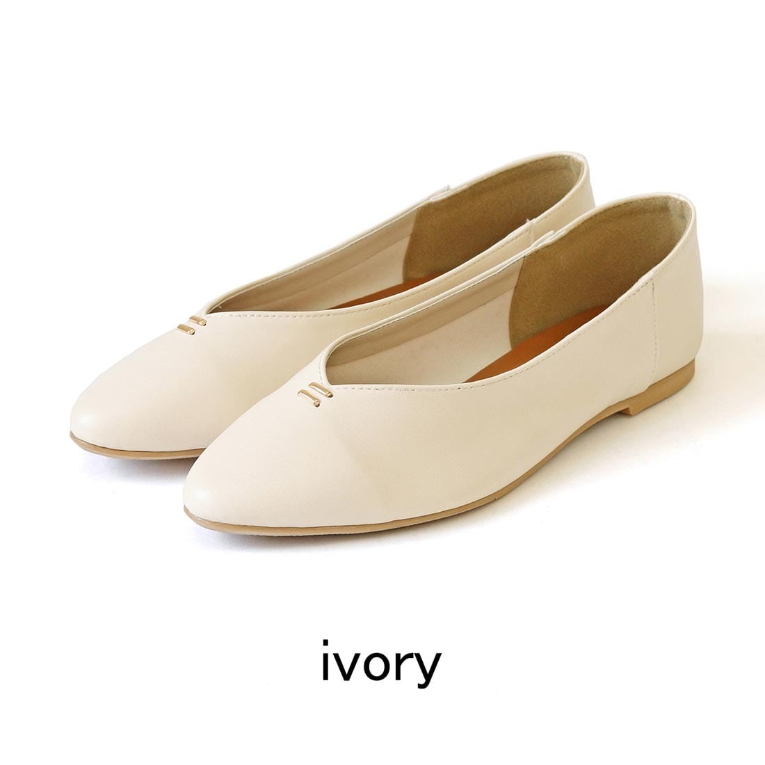 柔らかい合成皮革を使用した、足元をすっきり見せるVカットフラットパンプス。