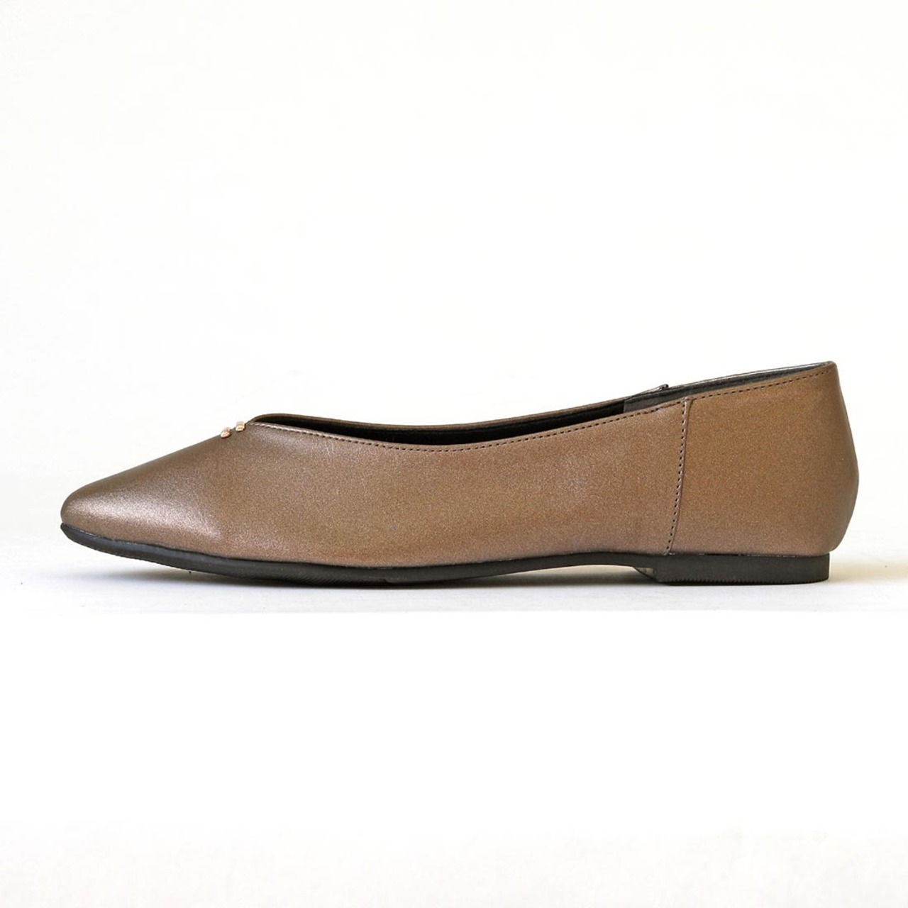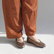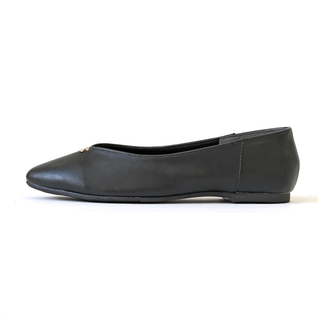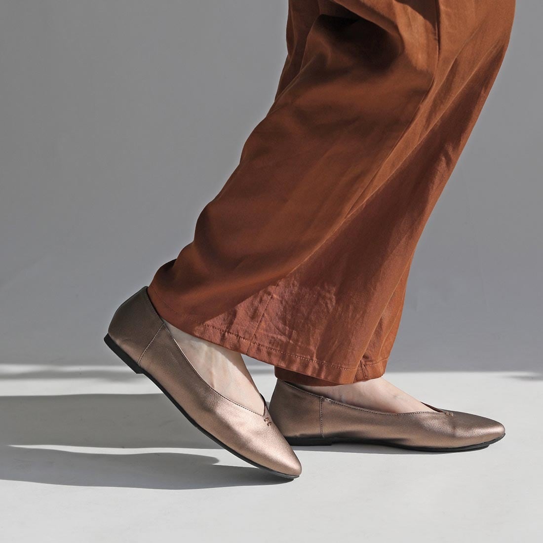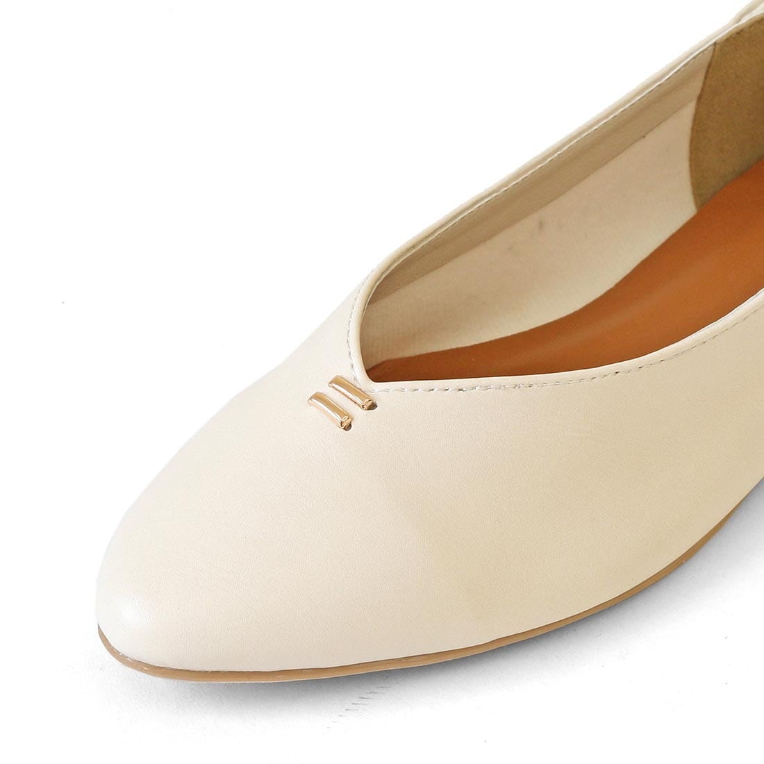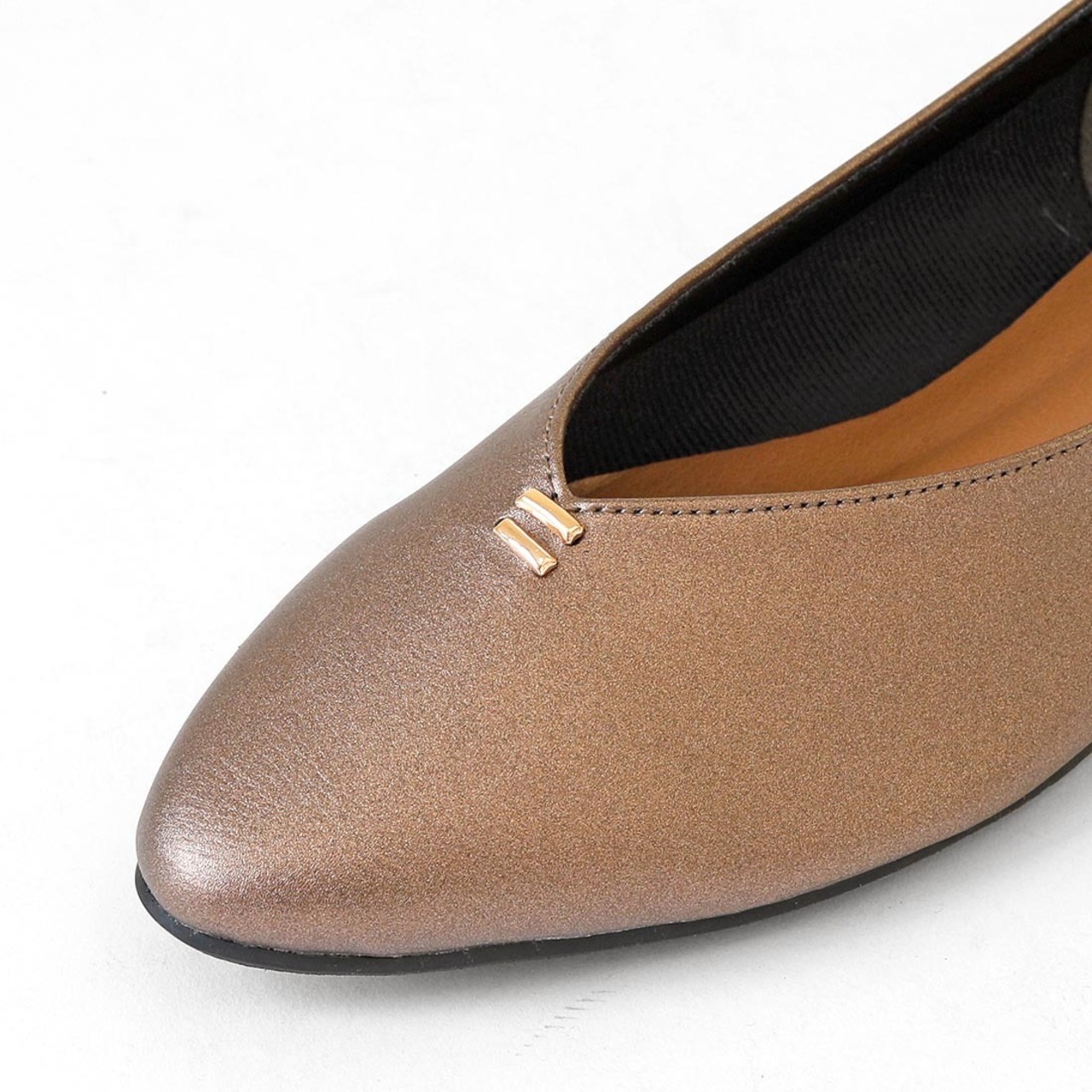 柔らかい合成皮革を使用した、足元をすっきり見せるVカットフラットパンプス。