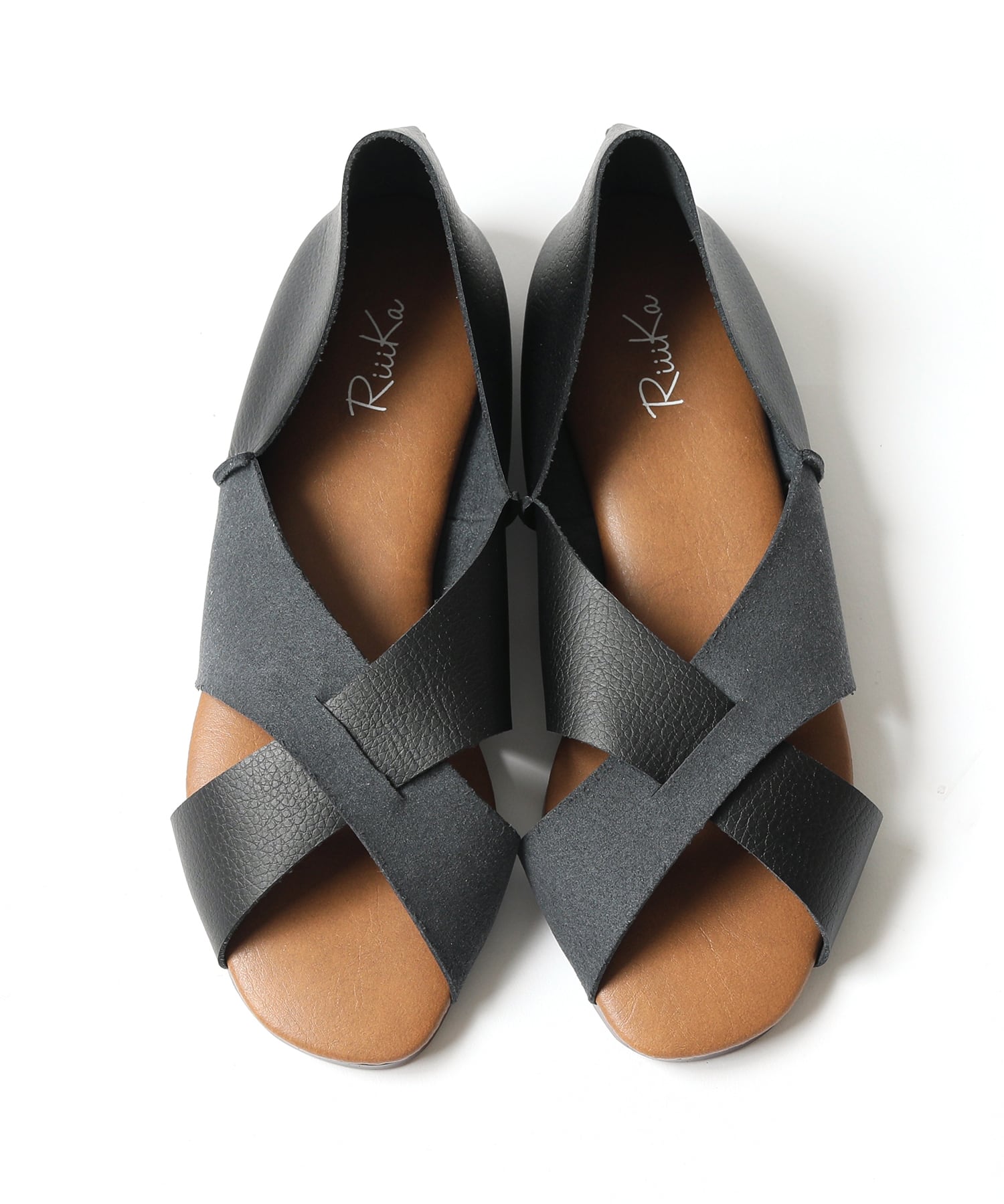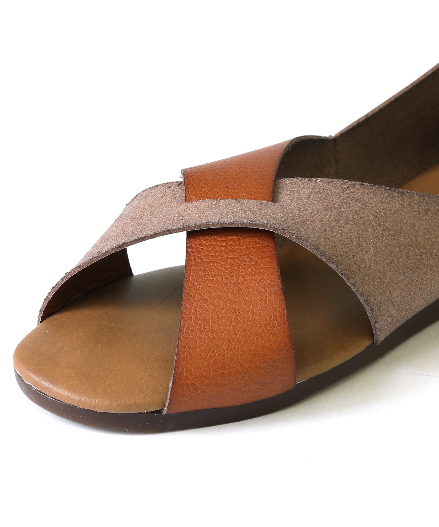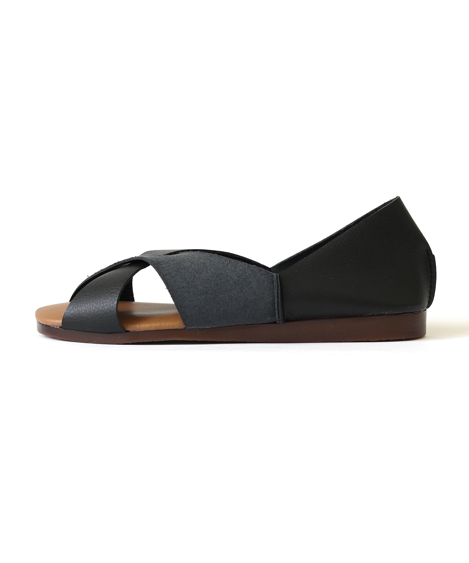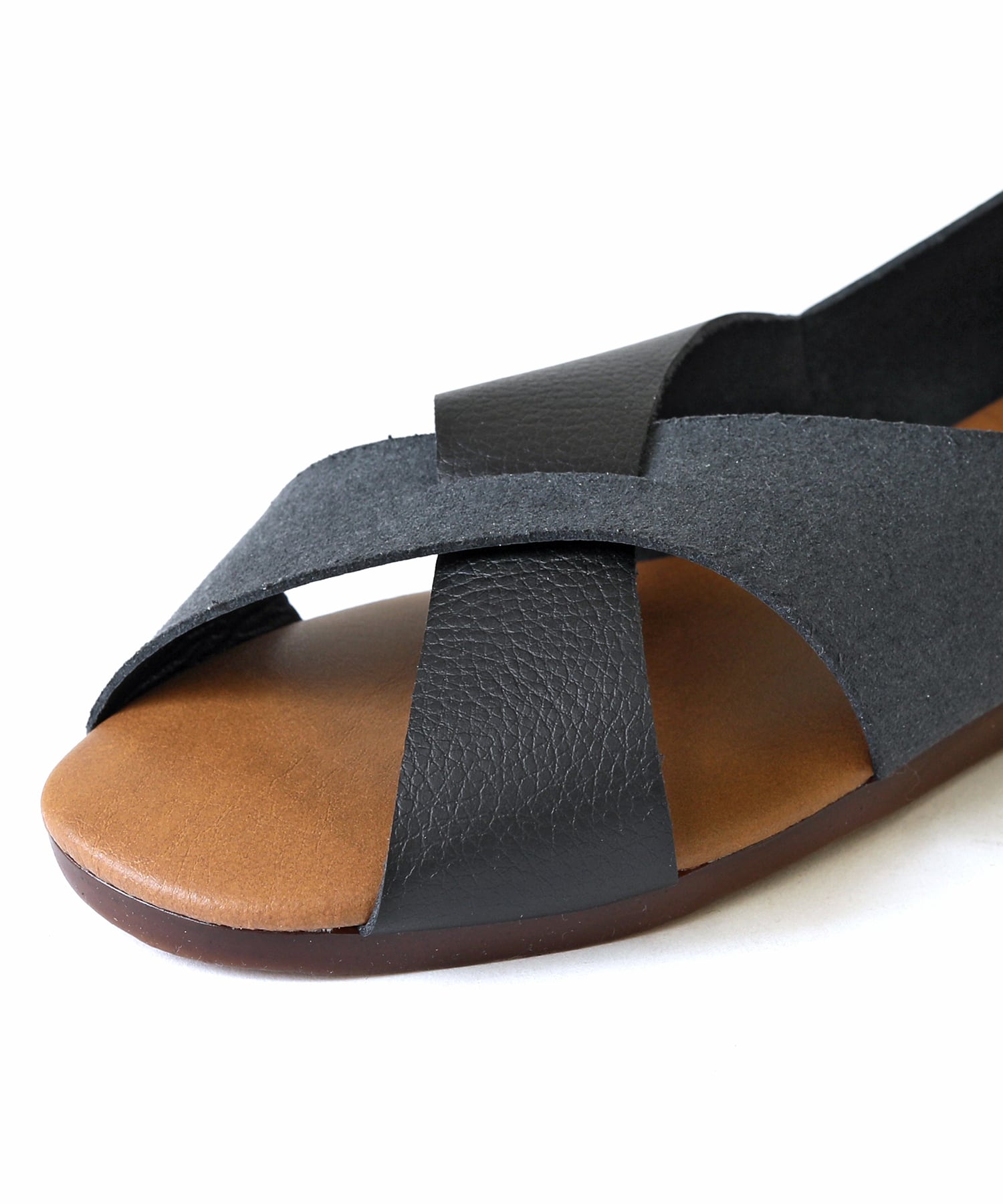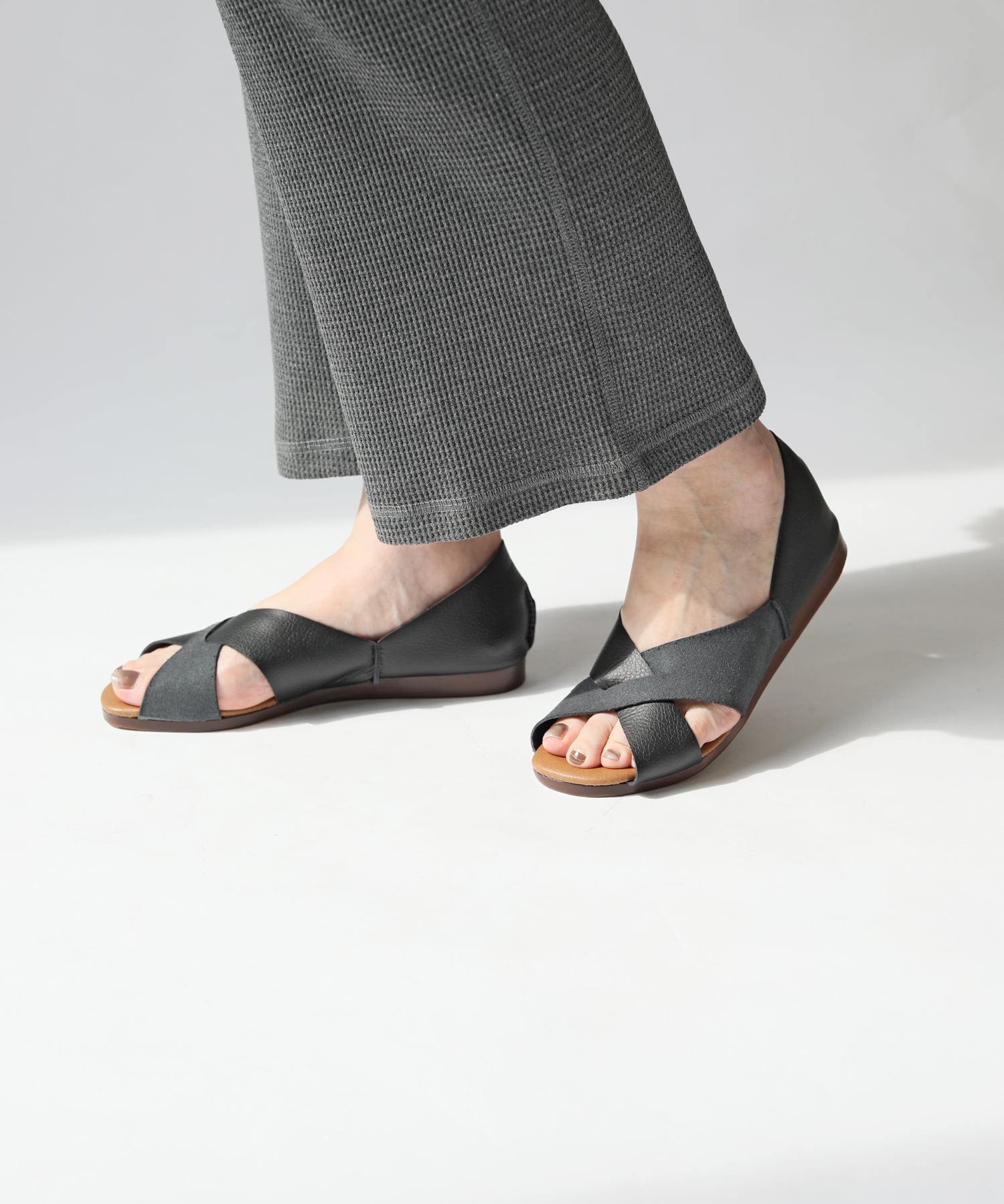 オープントゥのクロスデザインが涼しげな印象。真夏にも履いていただけるフラットサンダルです。