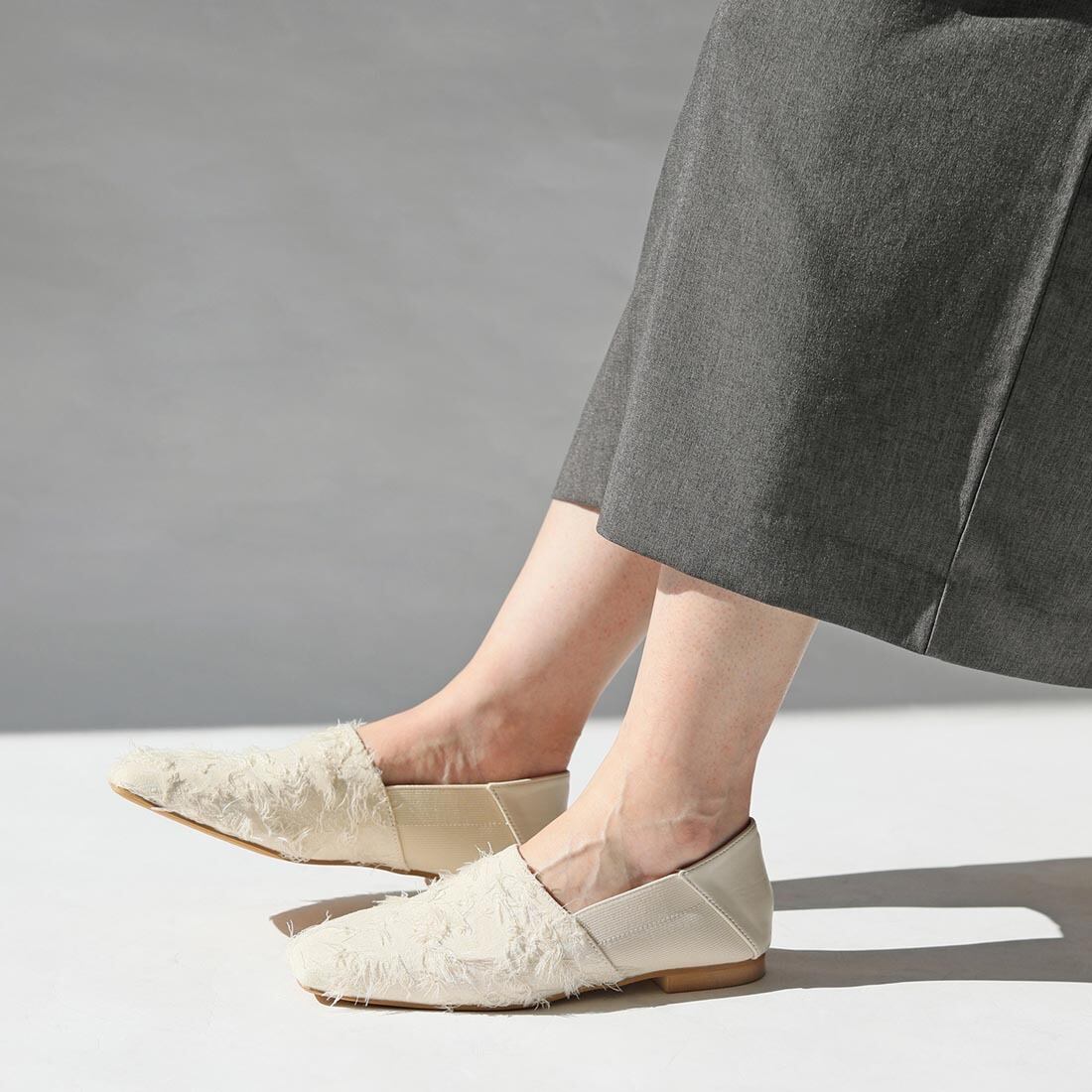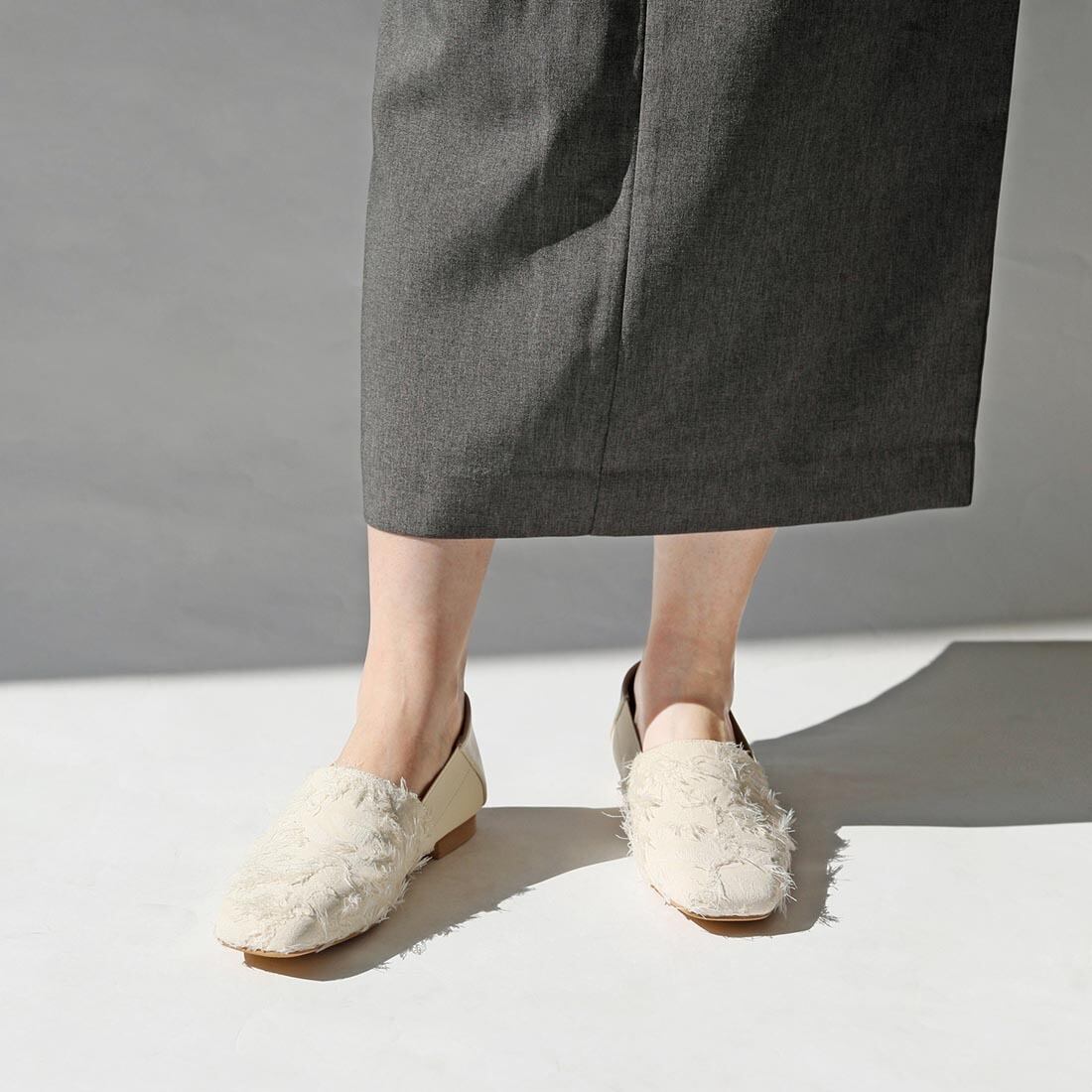 シンプルで毎日使えるのに、ちょっとした素材感の違いで雰囲気が変わるスクエアトゥスリッポンです。